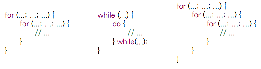 여태까지 우리가 배운 반복문은 while, do~while, for문이 있었습니다. 이것을 서로 중첩시켜 아래와 같이 반복문 안에서 또 하나의 반복문을 삽입할 수 있습니다. 제한없이 반복문을 중첩시킬 수 있지만 3중 이상의 반복문은 잘 사용하지 않습니다. 중첩이 깊어질수록 실행 시간이 기하급수적으로 증가하고 코드의 가독성을 해치기 때문입니다.