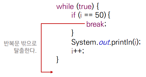 break문은 switch문에서 본 적이 있습니다. 그때는 switch문 밖을 벗어나는 데 사용됐지만, 이번에는 반복문을 벗어나고 싶을 때 사용합니다. 아래의 예제는 무한 루프에 break문을 사용한 예제입니다.