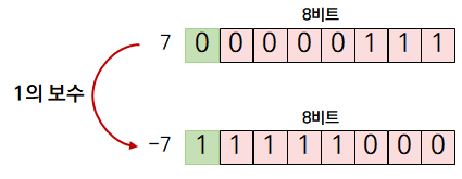 1의 보수는 해당 양수의 모든 비트를 반전시켜 음수를 표현하는 방법입니다. 부호 절댓값 방식과 동일하게 최상위 비트는 부호 비트로 쓰입니다.