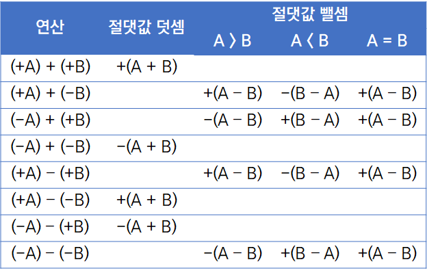아래의 연산표를 보면 알 수 있듯이, 부호 절댓값 방식에서의 연산은 그렇게 간단하지 않습니다. 더욱 간단한 방법은 없을까요?