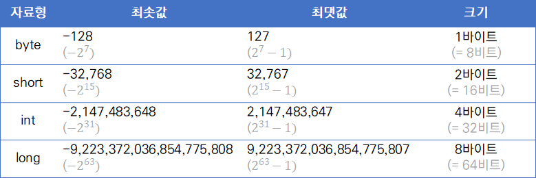 정수형은 양의 정수, 음의 정수를 저장할 수 있습니다. 타입의 크기에 따라 저장할 수 있는 값의 범위가 정해집니다. 정수형의 값의 범위는 \( -2^{n-1} \sim 2^{n-1}-1 \)이며, n에는 메모리 비트 수가 들어갑니다. 예를 들어서 int형은 크기가 32비트이므로 값의 범위는 \( -2^{31} \sim 2^{31}-1 \)임을 알 수 있습니다.