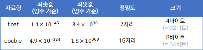 실수를 저장할 수 있는 타입에는 float, double이 있습니다. double이란 이름은 float형보다 약 2배의 정밀도를 가진다는 뜻에서 붙여진 것으로, 메모리 공간을 절약하는 것보다 정밀도가 중요한 경우에는 float가 아닌 double을 사용합니다. 다양한 상황에서 float의 정밀도로는 충분하지 않을 때가 많기 때문에 특수한 경우를 제외하고는 double형을 사용할 것을 권장합니다.