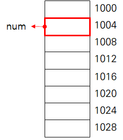 이 문장은 10진수 정수(integer)를 저장하기 위한 메모리 공간을 할당하겠다는 말이 됩니다. 그리고 int 옆에 보이는 num은 우리가 접근하기 위하여 메모리 공간에 붙여진 이름입니다. 이를 변수명이라고 부르며 간혹 식별자(identifier)라고 부르기도 합니다. 이를 메모리 공간에서 살펴보면 다음과 같은 모습일 것입니다.