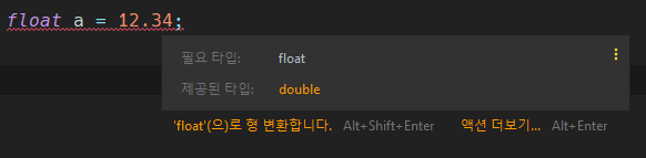 이 경우에는 컴파일러에게 이 값이 float형임을 알려주기 위해서 접미사 f 또는 F를 붙여야 합니다. 참고로, 접미사 d 또는 D를 붙여서 double형임을 알려줄 수도 있습니다.